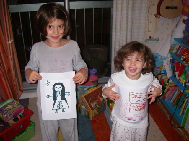 Julie a dessiné sa maîtresse qui a de longs cheveux noirs et vient d’Amérique du Sud. Elle prend la pose avec Maurine, en pyjama.