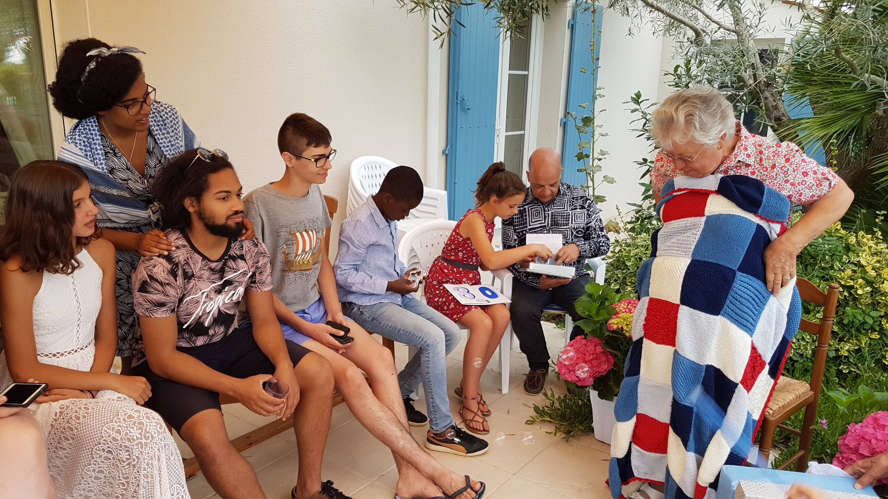Chantal découvre la couverture que toute la famille lui a tricotée.