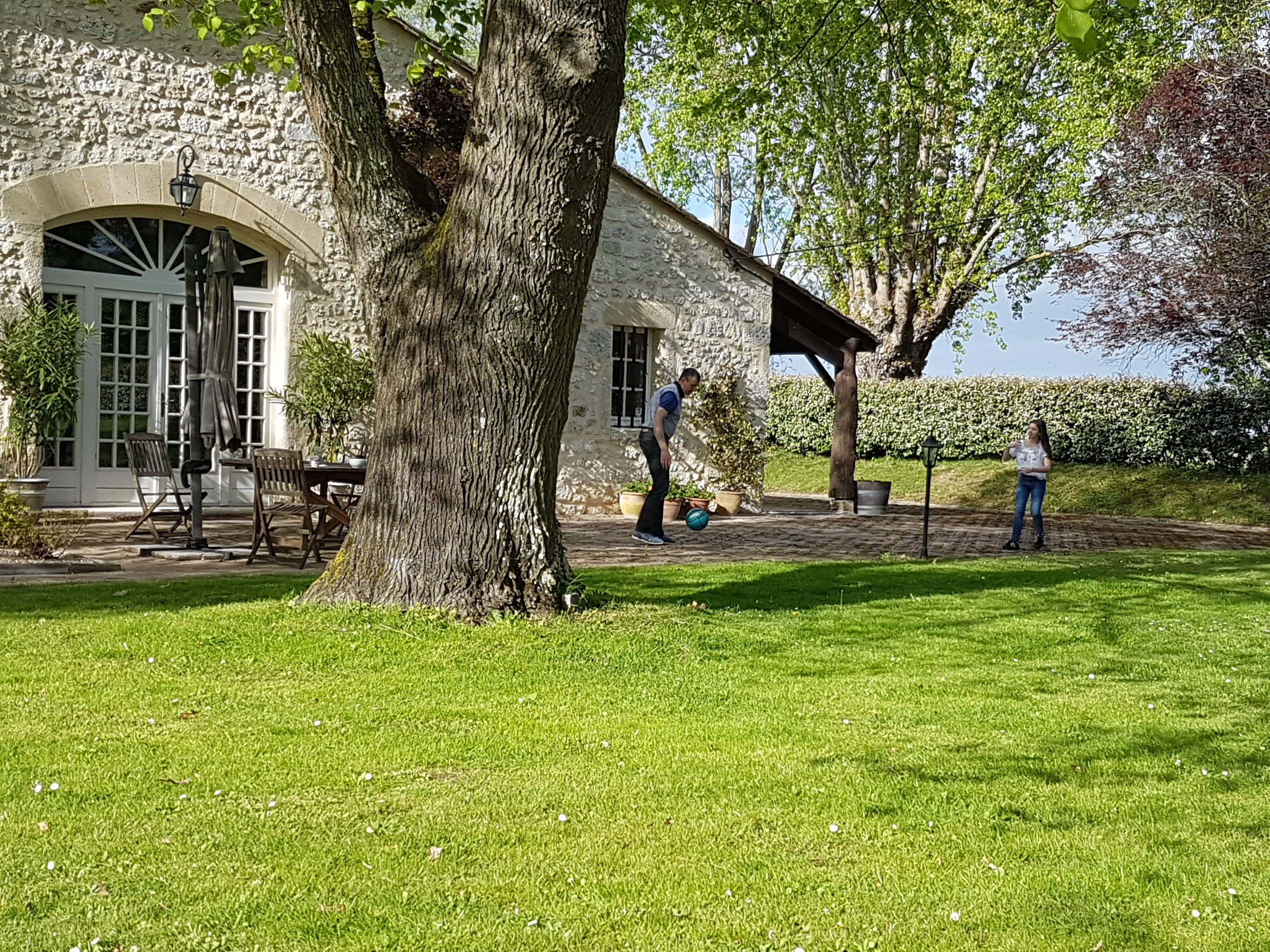 A l’arrivée nous sommes accueillis avec une bonne bouteille de Bordeaux dans une grande bastide au milieu des vignes : chateau Lestage à Sainte Radegonde, tous près de Castillon la Bataille (où la guerre de 100 ans prit fin), et de Saint Emilion… Quel bel échange ! 😁