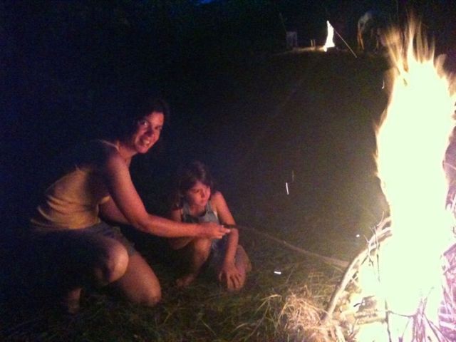 Et comme nous ne voulions pas quitter la région sans visiter un château, nous nous sommes précipités à celui de Castelnaud ce matin. Ça tombe bien car le temps se couvre et il fait lourd. Un château chargé d’histoires de batailles et de reconstructions. Des animations extérieures pour les grands et les petits : forge, pièce de théâtre, démonstration de trébuchet, … Un musée des armes du Moyen Age ! Ballade en auto pour endormir Maurine surexcitée et fin de journée au camping avec collecte de bois pour un feu encore plus long. Isabelle nous prépare déjà la suite du voyage. Maurine qui n’arrive pas à s’endormir fait du coloriage au coin du feu : la lampe de poche dans une main, le crayon dans l’autre. Grillades de chamalows avec nos nouveau voisins, français cette fois.