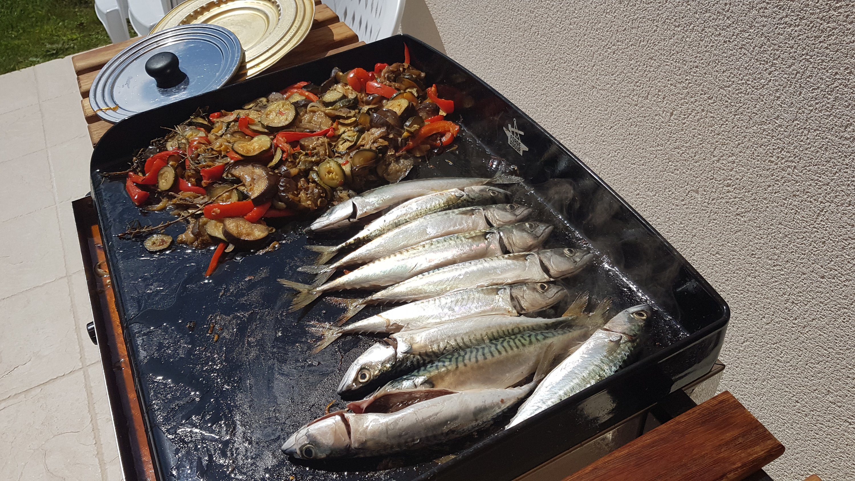 Les maquereaux luisent à côté des légumes confits par la plancha… miam miam et clap clap (comme on dit en philippin = chin chin! ).