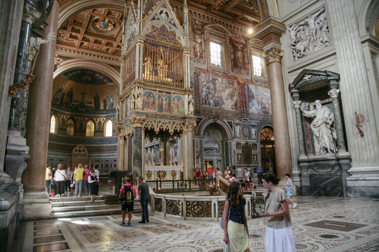 Pour déjeuner, nous trouvons par chance une excellente pizzeria, super service, et bon marché en allant vers la suite de nos découvertes : Nous visitons la cathédrale saint Jean de Latran et ses imposantes statues. Belle mosaïque aussi derrière le cœur. Mosaïques de marbre au sol. C’est la cathédrale de Rome où officie archevêque mais aussi l’évêque, donc le pape. Se reposer ici quelques minutes au frais nous fait du bien à l’heure de la sieste, surtout après cette matinée si chaude au Colisée. Nous rencontrons un moine, Philippe, pénitent du Vatican franciscain belge, qui nous accueille joviale ment et nous raconte des tas d’histoires.